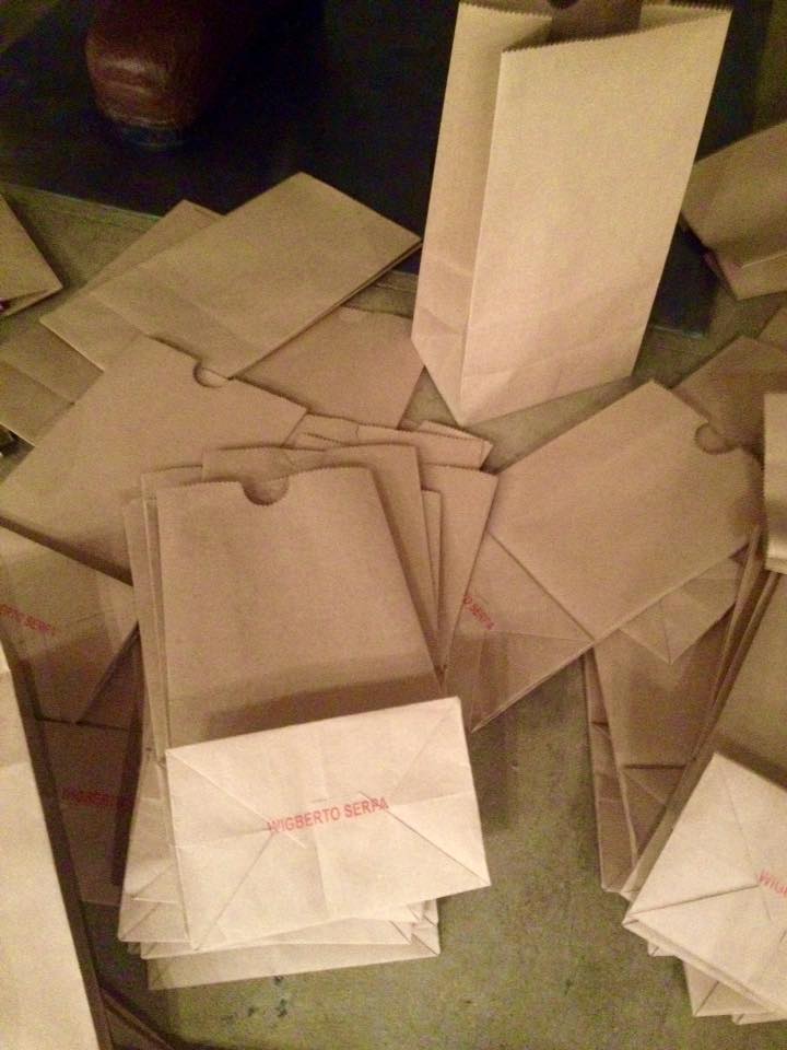 Wigberto Serpa is a fifteen foot paper mache & foam representation of a paper bag machine operator overseeing a large pile of bags produced under his watch. In the early 1970’s the Regis Paper Company in an effort to produce higher quality paper bags, had machine operators take responsibility for their product by placing their names on every bag produced during their shift. Wigberto Serpa is a name commonly found on paper bags today. No machinery or software was used in the construction of this work. The statue and the bags are all made by hand.